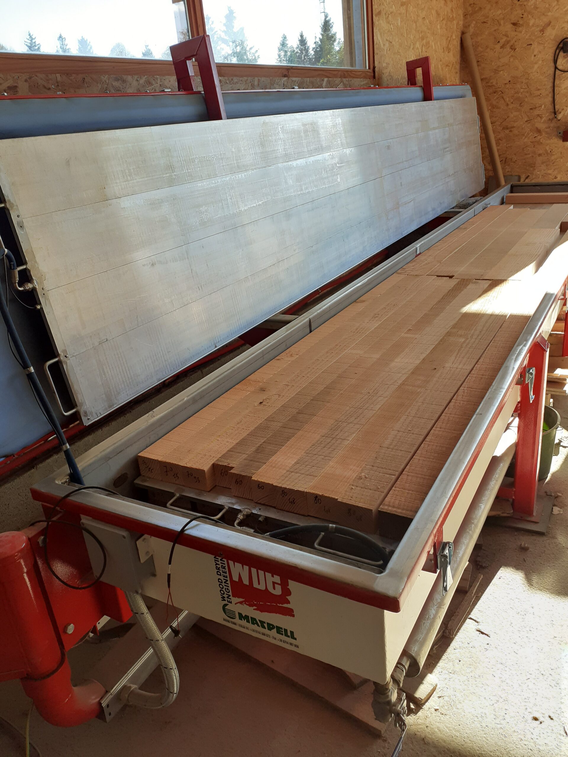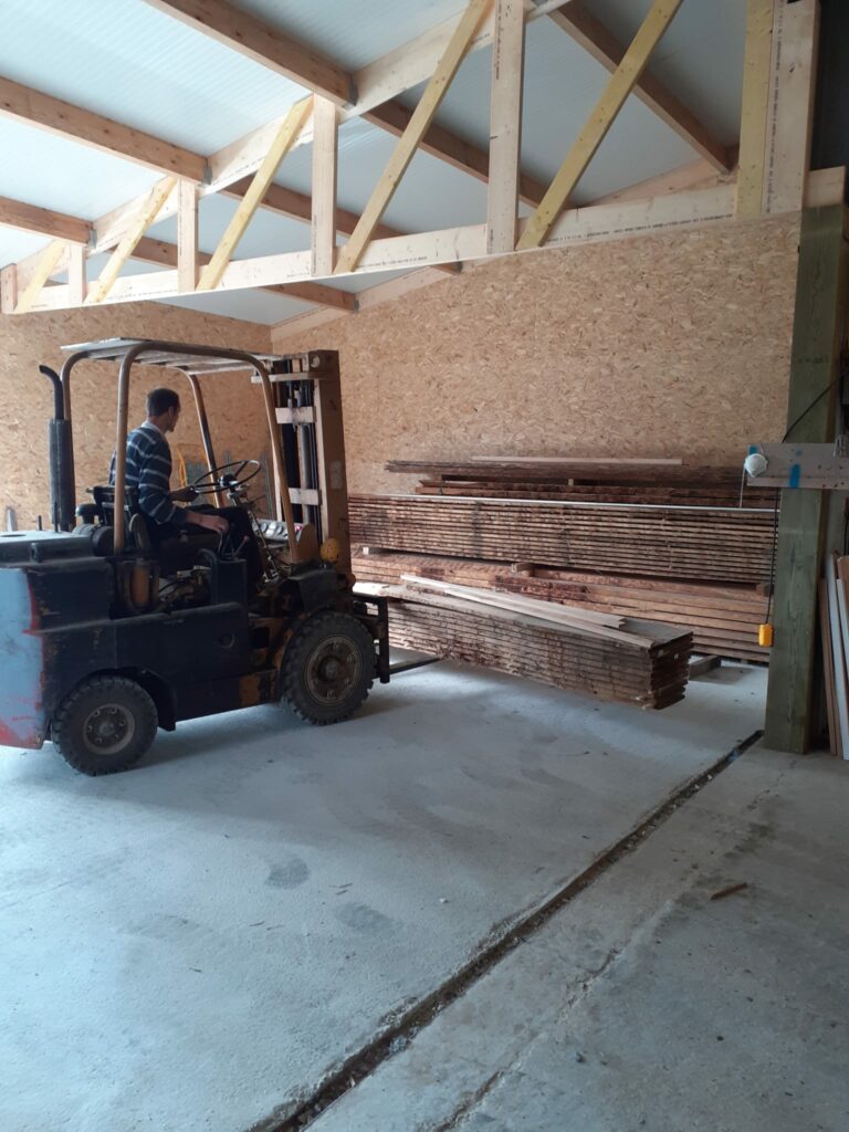 Nous poursuivons nos efforts de professionnalisation dans la transformation de bois massif: après avoir commencé le stockage de billes de bois en séchage naturel en extérieur depuis 2021, nous créons un nouvel espace de stockage couvert. Nous avons aménagé aussi une extension à la partie atelier afin d'accueillir un stockage de bois dans un volume isolé et chauffé. Nous avons fait l'acquisition d'un séchoir sous vide , équipement moderne et d'une efficacité énergétique cohérente avec notre démarche écologique.